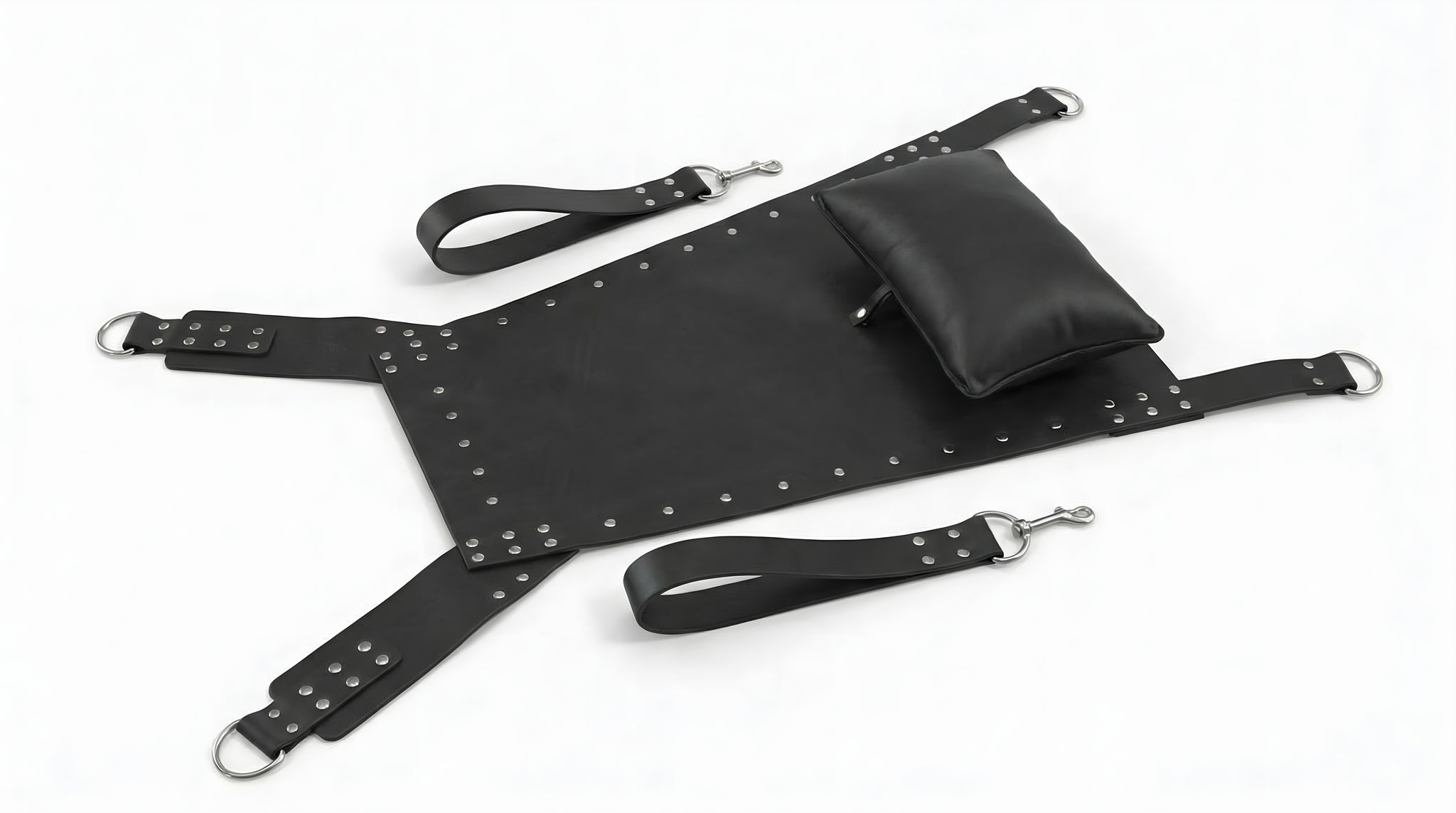 This sling is one of the finest slings available. It includes a detachable leather pillow and a pair of foot stirrups that clip easily to chains for height and angle adjustment. Made from the heaviest weight Latigo leather and heavy-duty rivets to maximize strength. Ends are custom modified to a 45 degree angle to work beautifully with your DungeonBed.
